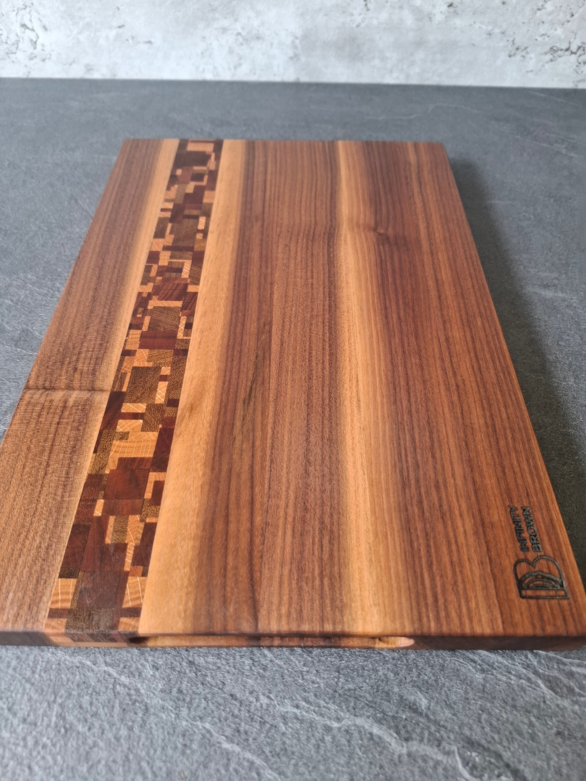 Tabla de cortar hecha a mano elaborada con madera de Nogal de primera calidad, con un diseño elegante de líneas creadas con diferentes maderas, dando un toque moderno y único. Perfecta como regalo o para tu cocina.