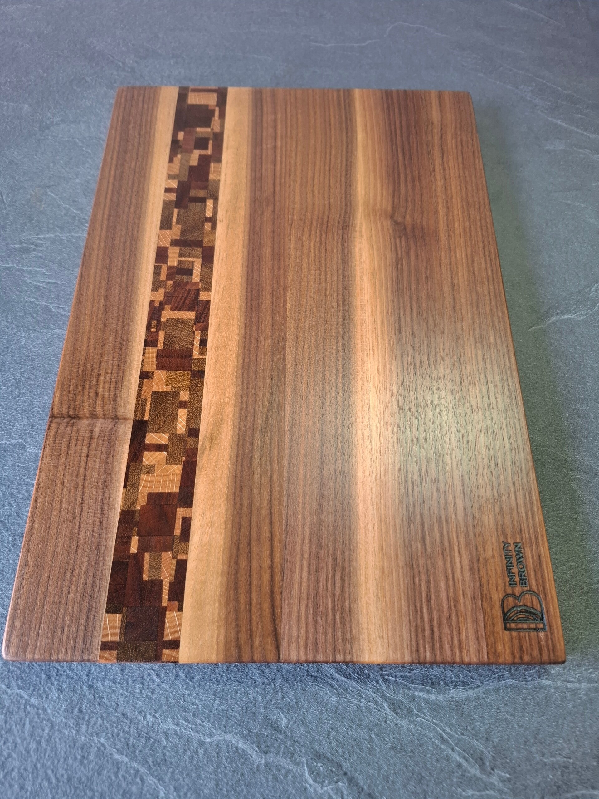Tabla de cortar hecha a mano elaborada con madera de Nogal de primera calidad,con un diseño elegante de lineas creadas con diferentes maderas,dando un toque moderno y unico. Medidas:38cm x 25.5cm x22mm Extras:Con ranura en los 2 cantos para un agarre mejor y mas comodo. Ecoligico:tratadas con cera de abeja natural y aceite mineral aptos para contacto de alimentos. Perfecta como regalo o para tu cocina.